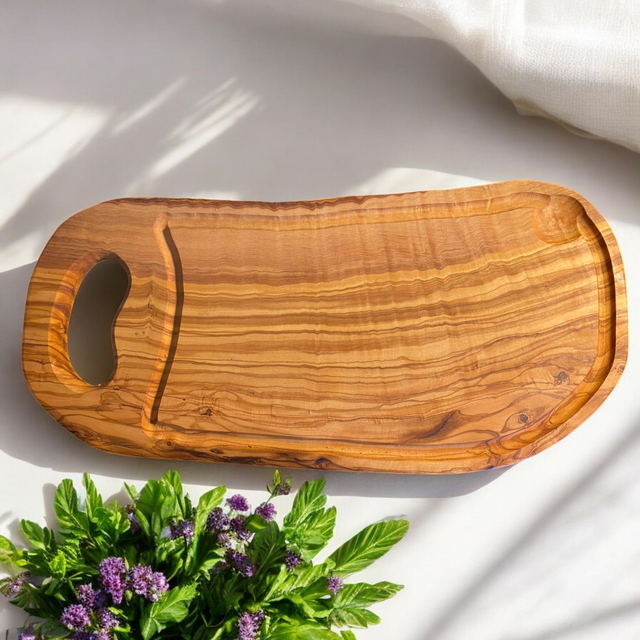 Enhance your dining experience with this handcrafted olive wood board, a versatile steak, cheese, cutting, and chopping board featuring a handle and jus rim for practical serving and presentation. The rustic edge design brings a natural, artisanal touch to your kitchen, making it perfect for serving steak, grilled vegetables, and roasted meats.