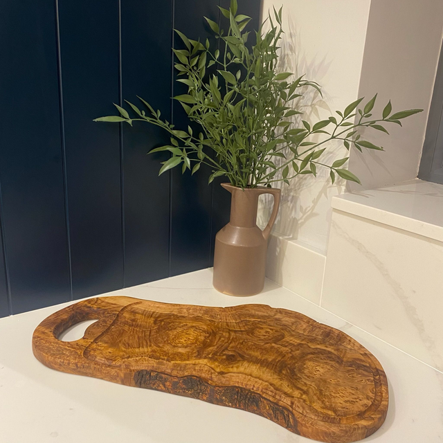 Enhance your dining experience with this handcrafted olive wood board, a versatile steak, cheese, cutting, and chopping board featuring a handle and jus rim for practical serving and presentation. The rustic edge design brings a natural, artisanal touch to your kitchen, making it perfect for serving steak, grilled vegetables, and roasted meats.