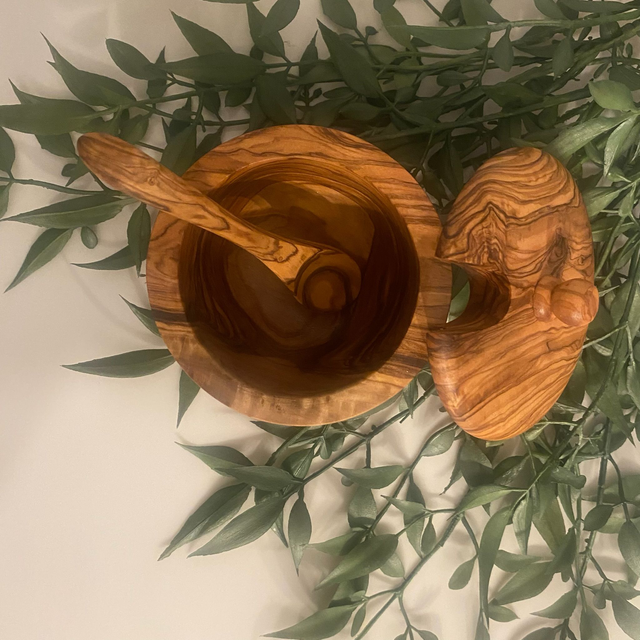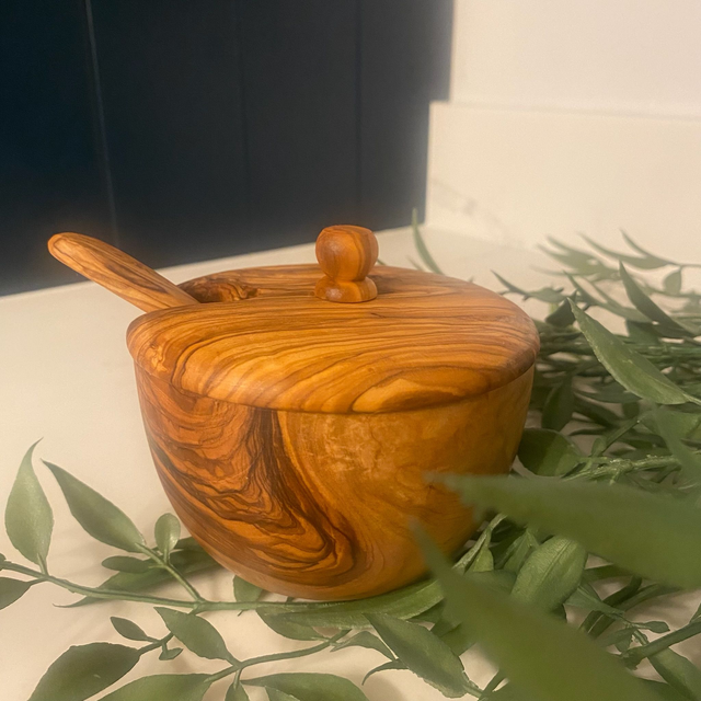 Olive Wood Sugar / Salt Bowl with Spoon – Handcrafted Rustic Kitchen Storage