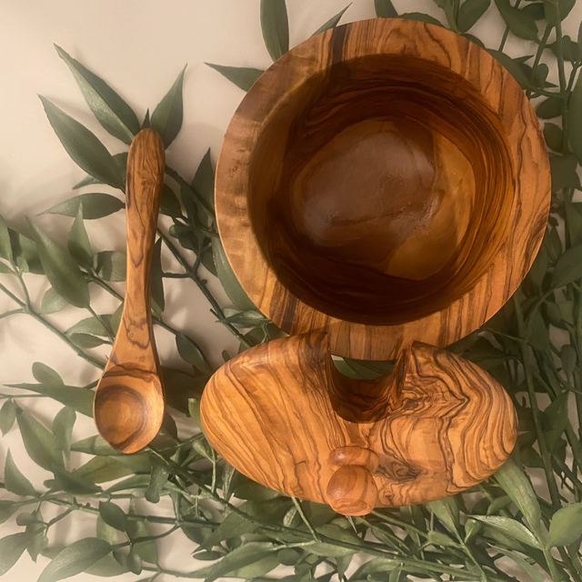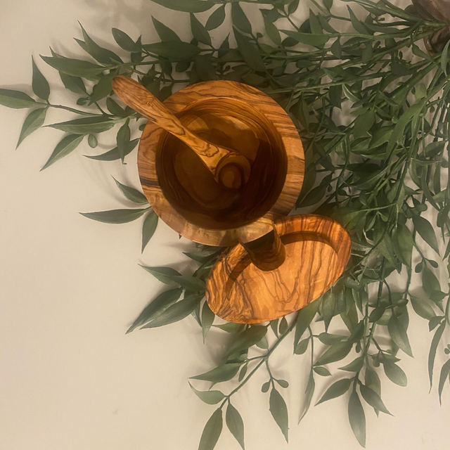Every piece is hand-carved, making each bowl and spoon entirely unique. Its warm, organic look brings a Mediterranean charm to any kitchen space — ideal for everyday cooking, coffee stations, or table serving.