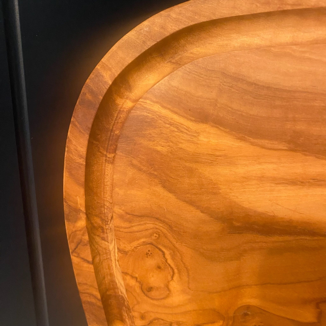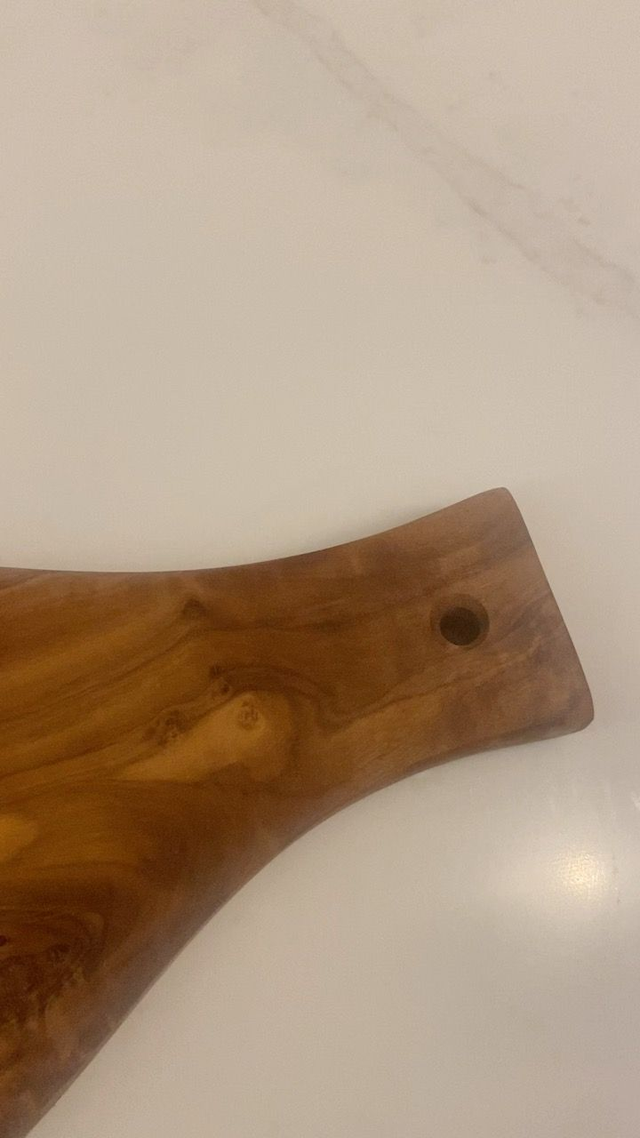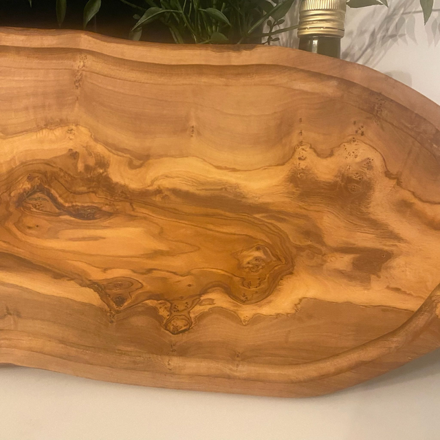 This long olive wood serving board with handle doubles as a cheese, cutting, and chopping board and is the perfect canvas for displaying charcuterie, breads, or appetisers in style. Its generous length and sturdy handle make it easy to carry and serve, whether for casual gatherings or formal occasions. You can have it with or without jus groove.